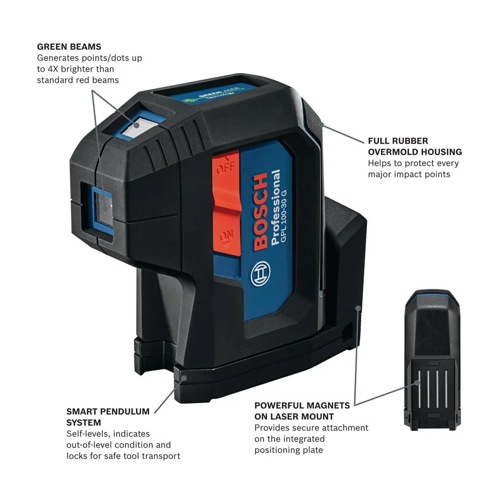 The Bosch GPL100-30G features a 3-point, self-leveling laser with plus orv minus 1/8 in. accuracy at 30 ft. for up/down plumb, align and level applications. This unit features Green-Beam technology, which is up to 4X brighter than standard red beams. It also has the Bosch-exclusive VisiMax technology, which delivers maximum beam brightness in most jobsite conditions. The unit includes point projection to the front, so it can be used in a variety of positions for flexibility on the job. It is faster than a standard manual plumb bob. The unit includes several durability features, such as the Smart Pendulum System to lock the laser when switched off, 360° rotation, a hard carrying case and full rubber over mold housing. The integrated multi-purpose laser mount features strong magnets and allows the user to mount the laser virtually anywhere.
