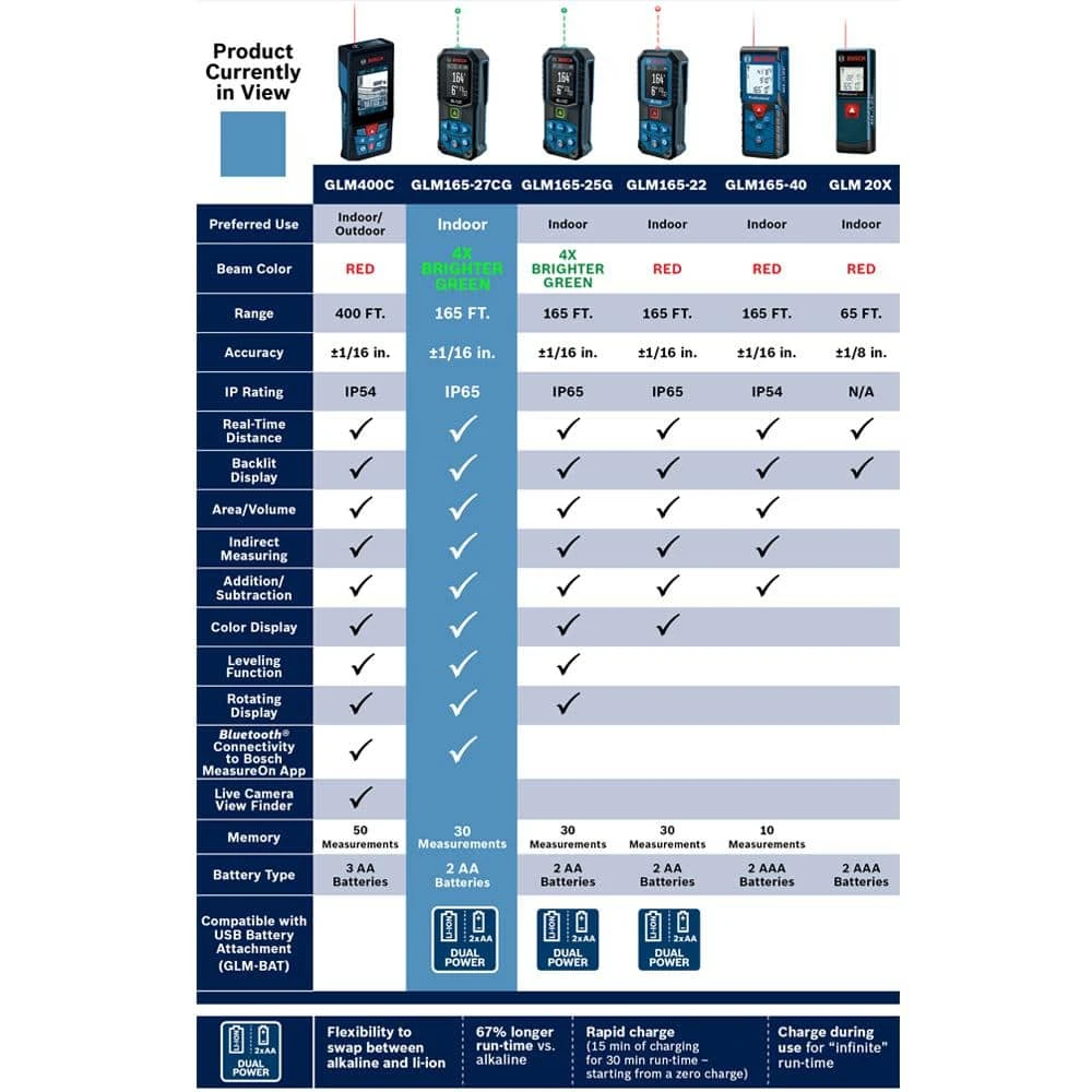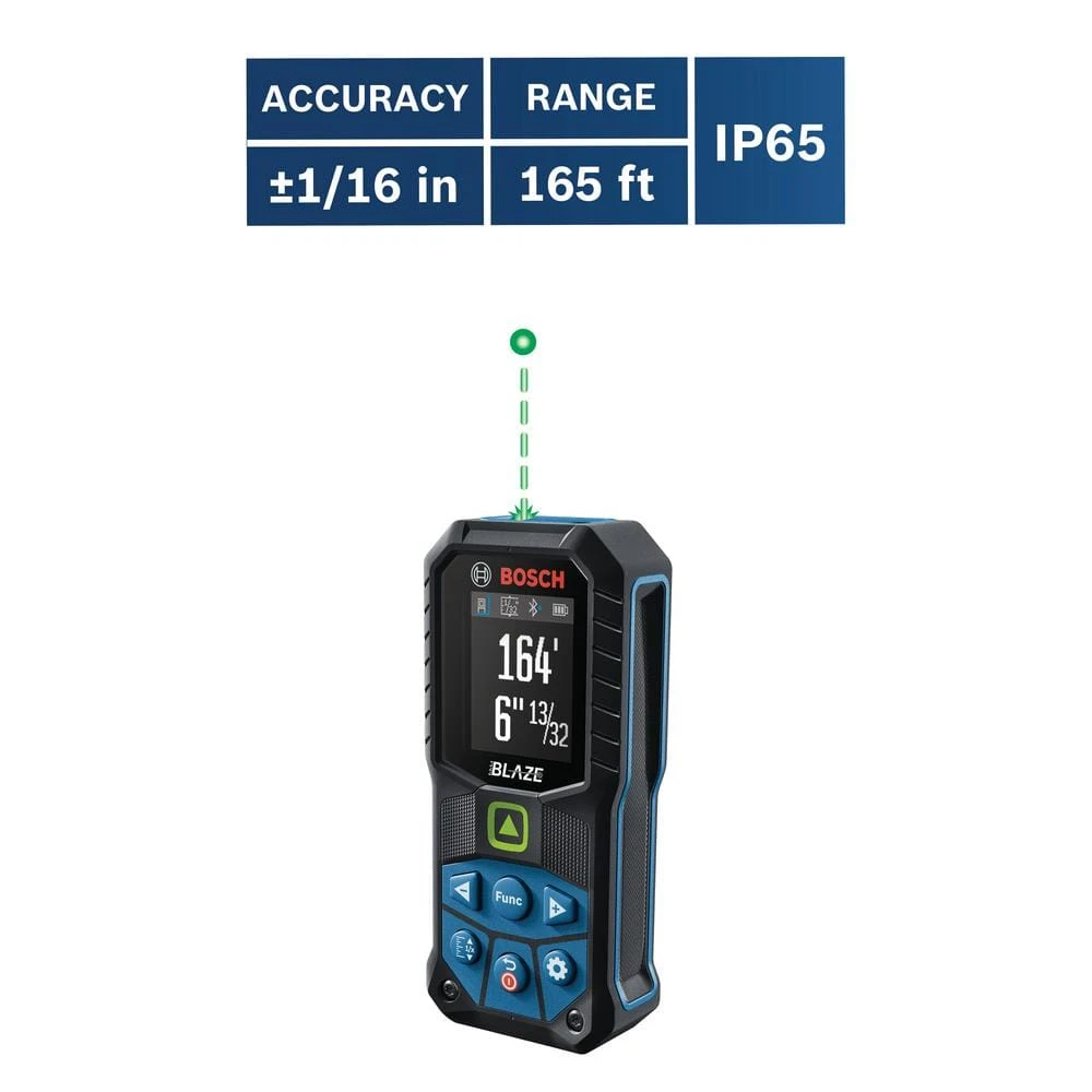 This 165 ft. green-beam laser measure is a fully featured tool with an easy-to-read color display, great accuracy, an inclinometer for tilt angle and reinforced housing for durability. The Bosch BLAZE GLM165-27CG uses Green-beam technology, which generates lines up to 4X brighter than standard red beams. The inclinometer shows the tilt angle up to 360° for easy angle and indirect measurements. The laser has accuracy up to plus minus 1/16 in., plus it includes a rounding button for easily rounds results and haptic feedback for loud jobsites. The digital laser measure also offers Bluetooth functionality, so users can digitally transfer measurements to a smartphone or tablet through the free MeasureOn app. It also has full rubber over mold housing, designed to be similar to a roll cage. It is IP65 rated and has an ergonomic design for better grip. It includes 11 different measuring functions, including real-time length, area, volume and indirect functions, and addition/subtraction capability.