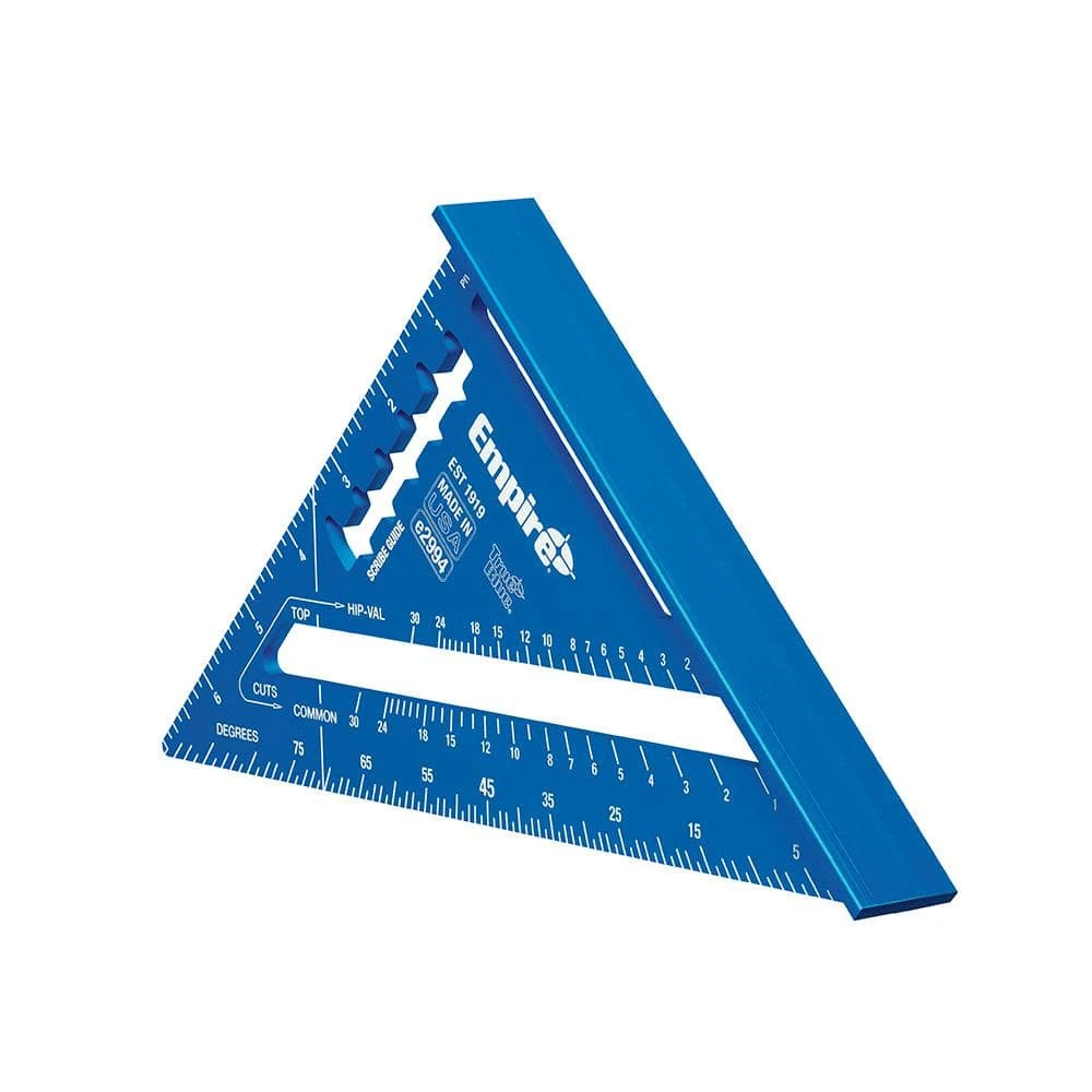 The Empire True Blue Laser Etched 7 in. Rafter Square (e2994) features permanent laser markings for superior readability in any light condition. SCRIBE-GUIDE precision scribe notches allow users to easily mark parallel lines on lumber. Hi-visibility laser etched markings won’t fade after heavy use on multiple job sites. The rafter layout square is made from a durable anodized aluminum that is more durable than diecast and will not rust or corrode after exposure to the harsh job site elements. The Empire rafter square features conversion tables for common applications. The square features an increased heel width that is up to 15% wider than leading competitors giving users increased stability on all job site material.