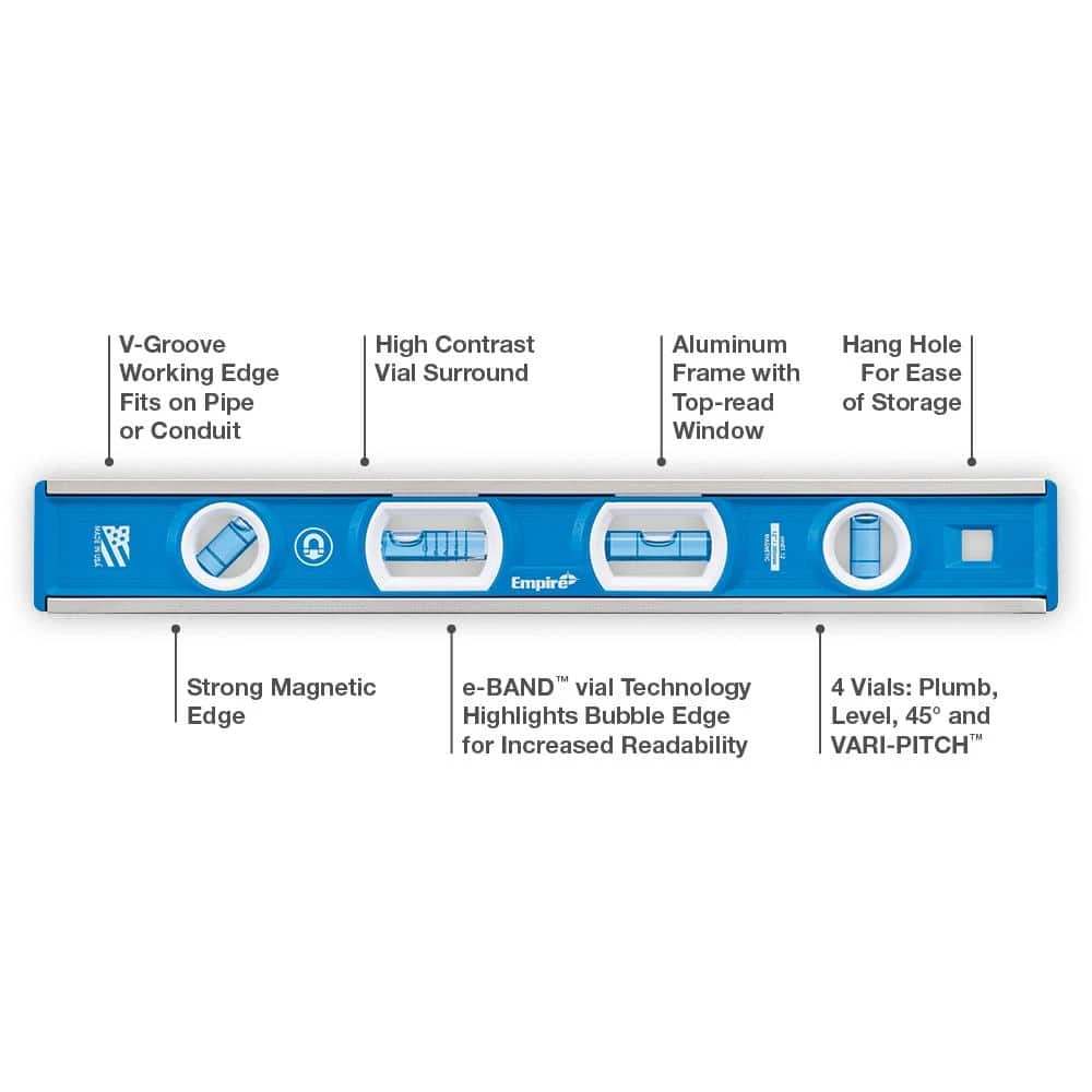 Designed to fit easily in your toolbox and handle almost any leveling need, the Empire 12 in. True Blue Magnetic Tool Box Level features a Vari-Pitch vial that reads slope or pitch in inches per foot. This makes it ideal for setting up a grade or measuring a slope. The True Blue blue-banded vials and top-read window help provide easy readings and the full-length aluminum frame offers exceptional durability, making it able to withstand a 10 ft. drop onto concrete and still maintain accuracy.