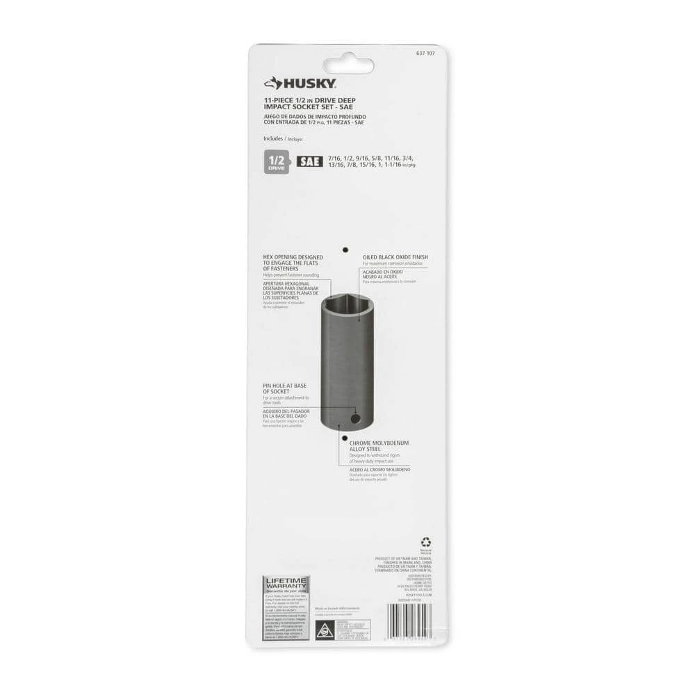 The Husky 1/2 in. Drive Deep SAE Impact Socket Set contains 11 deep 6-point SAE impact sockets. The Husky 1/2 in. drive deep impact socket set features sockets that are forged from chrome molybdenum alloy steel (Cr-Mo) and designed to withstand rigors of heavy duty auto and industrial use. Size markings have been hard stamped into the sockets for quick and easy identification that will never wear away. These impact sockets also feature off-corner loading which helps prevent fastener rounding, plus a pin hole at the base of each socket for use with pin and O-ring for a secure attachment to drive tools. An oiled, black oxide finish gives you maximum corrosion resistance. This 11-piece Husky deep impact socket set is perfect for both the professional mechanic’s or the DIYer’s garage.