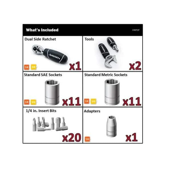 The Husky 46-Piece Stubby Ratchet Set includes 22 sockets and 20 screwdriver bits to hand various jobs around the house. The Stubby Ratchet features a 1/4 in. drive tang on 1 side and a 3/8 in. drive tang on the opposite side giving you the versatility to use both drive sizes on 1 ratchet. The co-molded grips on the ratchet, ratcheting bit driver and the adjustable wrench provide a strong and comfortable grip to get the job done. 72-tooth stubby ratchet needs only a 5 degree swing arc to turn a fastener, allowing you to work in tight places. The Husky magnetic bit driver included works with all standard 1/4 in. drive bits. Set is kept organized and travel-ready in the plastic storage case that is marked with each size.