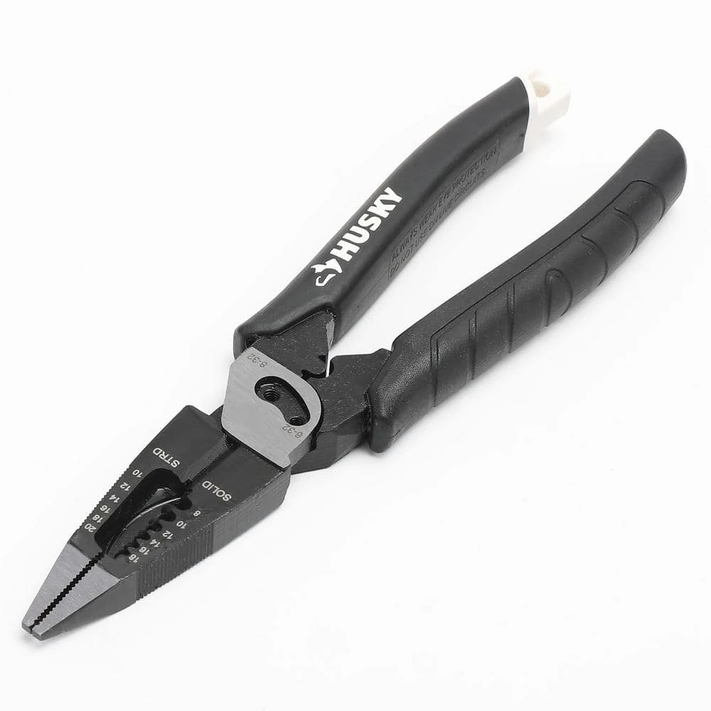 The 8 in. 6-in-1 Multifunction Pliers are ideal for working in tight spaces. They feature a long nose design for good performance as long nose, but also as a Spanner socket opening for gripping nuts and bolds. Non-slip gripping power, and heat-treated side-cutting knives for strength. Stripping function strips 8-AWG to 18-AWG solid and 10-AWG to 2- AWG stranded copper wire. Perfect for the home, workshop or jobsite.