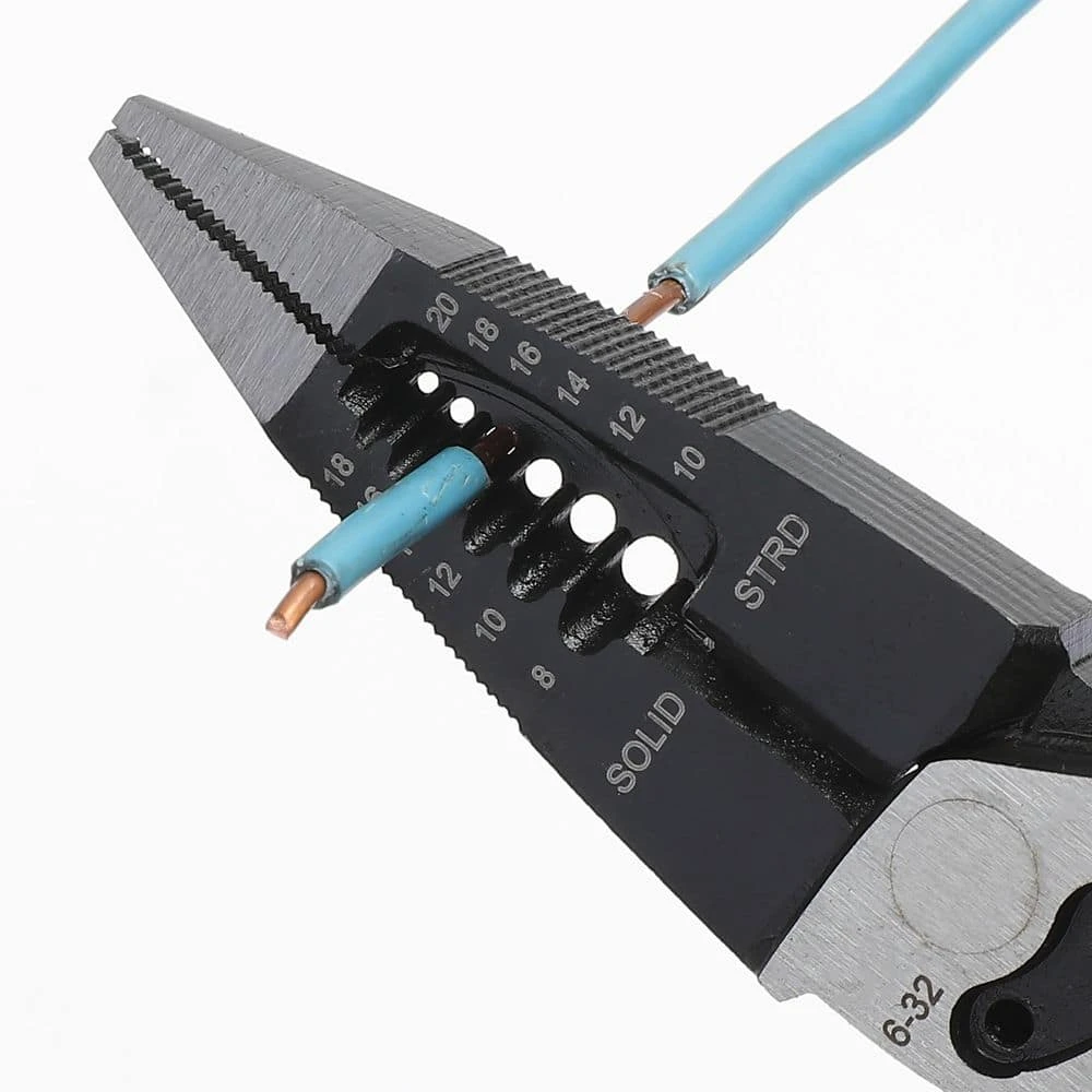 The 8 in. 6-In-1 Multi-function Pliers are ideal for working in tight spaces. They feature a long nose design for good performance as long nose, but also as a Spanner socket opening for gripping nuts and bolds. Non-slip gripping power and heat-treated side-cutting knives for strength. Stripping function strips 8-AWG to 18-AWG solid and 10-AWG to 2- AWG stranded copper wire. Perfect for the home, workshop or jobsite.