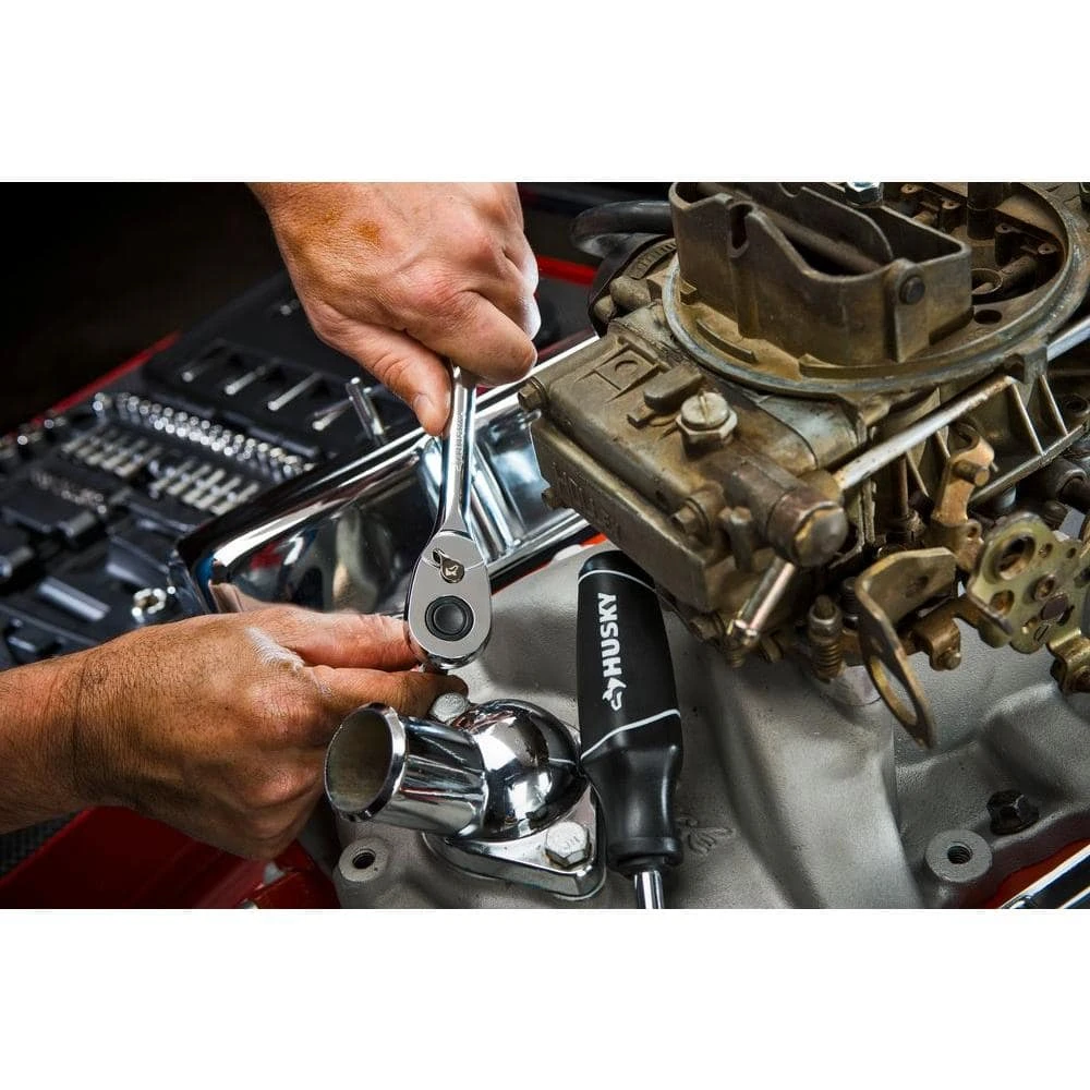 The Husky 94-Piece Mechanics Tool Set is a perfect set for the home DIYer or professional mechanic. The 53 different standard and deep sockets allow you to tackle a range of general fastening or repair projects. Sockets feature chamfered lead-ins to help provide a fast and easy placement onto drive tools and fasteners. Set also includes 37 accessories, 2 extensions, 2 ratchets and a storage case to keep it all organized. Compact and versatile for nearly any job, this mechanics tool set features an assortment of 1/4 in. and 3/8 in. drive sockets as well as accessory and drive tools for ultimate convenience. The 72 degree ratchets need only 5 degrees to turn a fastener, for hard to reach areas. For a complete product listing, see specification document.
