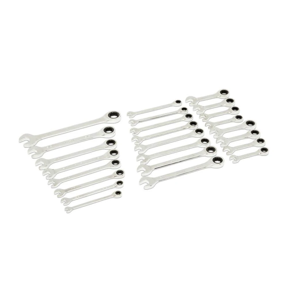 - Set includes 16 standard 12-point ratcheting wrenches covering sizes: eight SAE – 1/4 in., 5/16 in., 3/8 in., 7/16 in., 1/2 in., 9/16 in., 5/8 in., 3/4 in. and eight metric – 8 mm, 9 mm, 10 mm, 11 mm, 12 mm, 13 mm, 14 mm, 15 mm