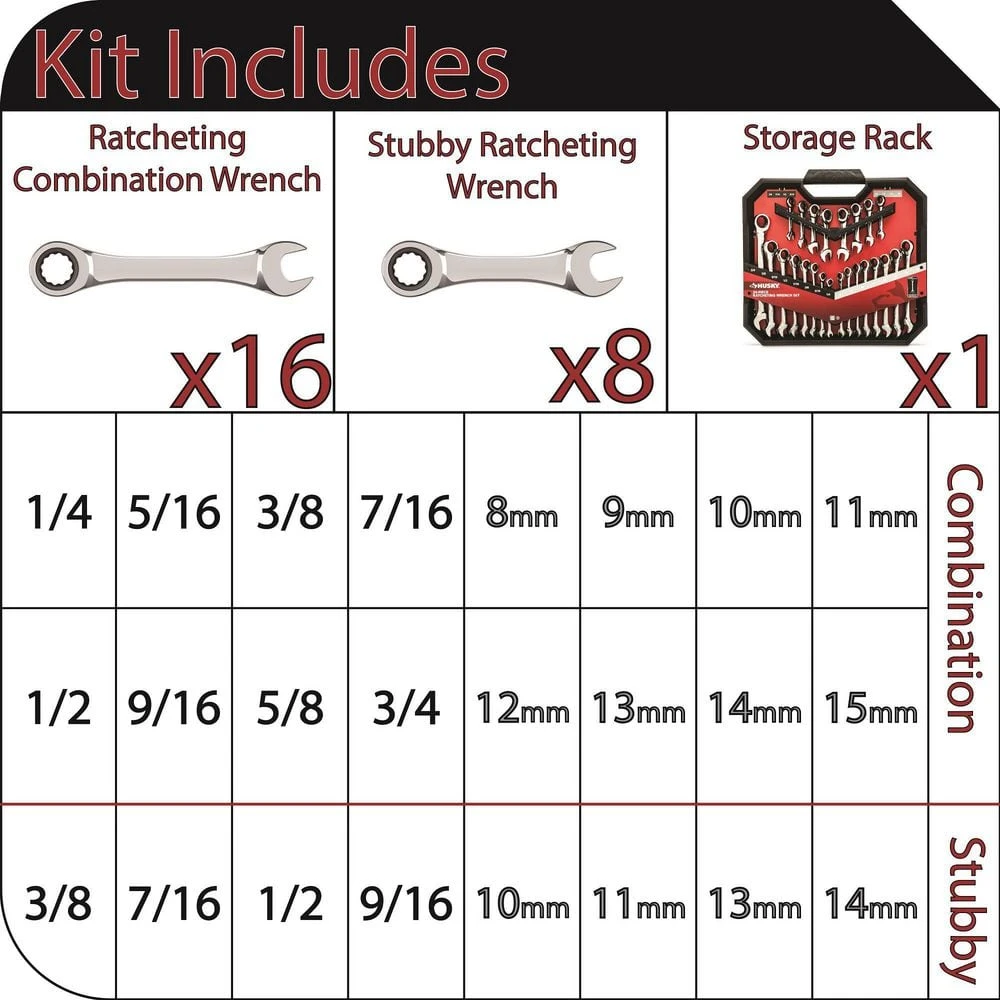 - Set also includes 8 stubby 12-point ratcheting wrenches covering sizes: four SAE – 3/8 in., 7/16 in., 1/2 in., 9/16 in. and four metric – 10 mm, 11 mm, 13 mm, 14 mm