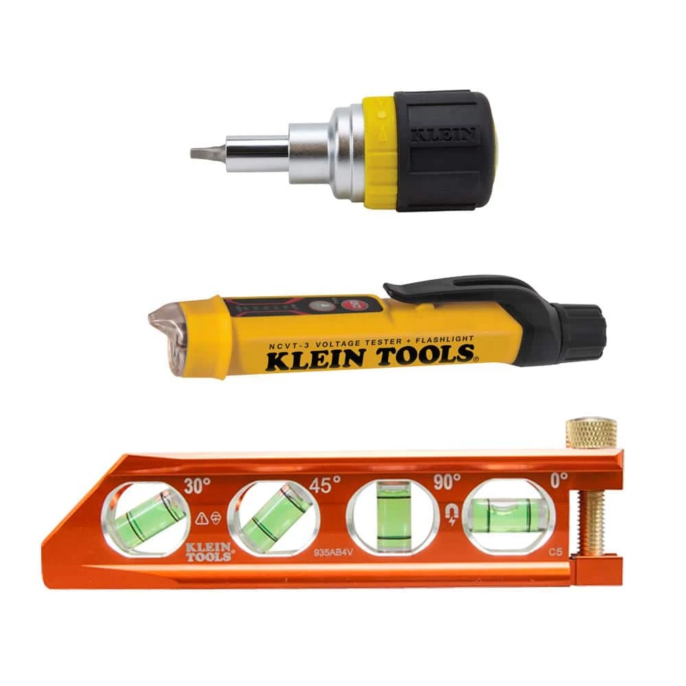 This 3-Piece Tool Set from Klein features the NCVT-3 Non-Contact Voltage Tester with Flashlight, the 6-in-1 Ratcheting Stubby Screwdriver with Square Recess Bits, and the 4-Vial ACCU-BEND Conduit Level. The voltage tester detects 12-Volt to 1,000-Volt AC and indicates the presence of voltage in cables, cords, circuit breakers, light fixtures, switches, outlets and wires. It can also detect AC voltage in doorbells, thermostats, low voltage lighting and irrigation systems. The screwdriver is ergonomic with a Cushion-Grip handle and made to be interchangeable. Eliminate dog legs and make conduit bending easier with the help of Klein’s ACCU-BEND Magnetic Level.