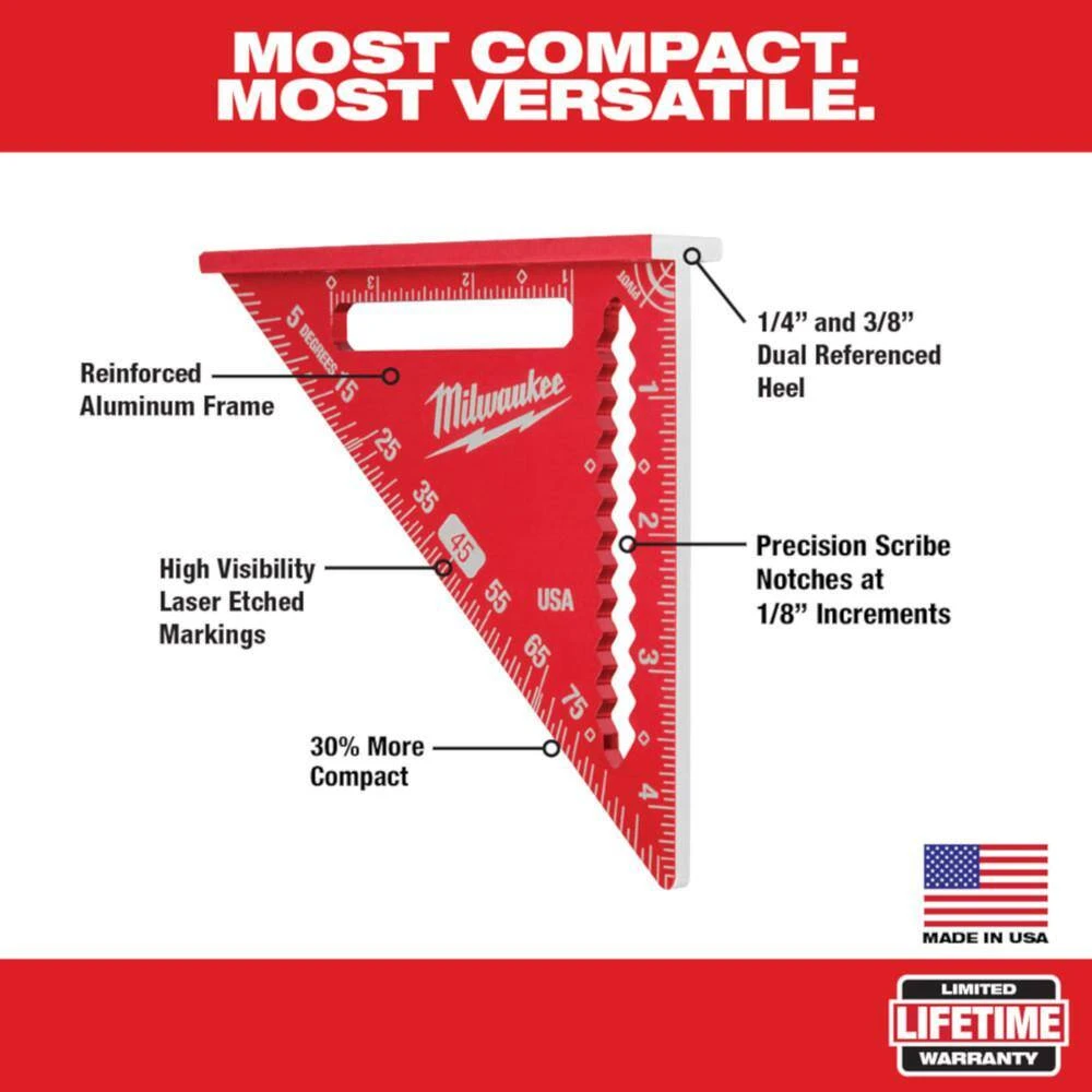 The Milwaukee 16 ft. W Blade Tape Measures have the longest reach and straightest standout in the industry. Users can reach further on the jobsite with up to 16 ft. of reach to take long measurements on their own. The Milwaukee blade design provides the straightest standout, reducing blade arc for efficient and accurate measuring. The tape measures are wear and impact-resistant with nylon bond blade protection and an additional anti-tear coating on the first 6 in. of the blade, reducing tape tear. Built to withstand the jobsite, the measuring tapes are constructed with a 5-point reinforced frame for impact resistance. The Milwaukee 4-1/2 in. Trim Square is an everyday carry layout solution. The Milwaukee Compact Speed Square is 35% smaller in size to easily fit into tight work spaces as well as the user’s pockets and pouches. High visibility laser etched markings will not wear off after heavy use, providing users with consistent high visibility throughout the life of the square. A 1/4 in. and 3/8 in. dual measurement heel also enables users to perform quick marks. The trim speed square is backed by a Milwaukee Limited Lifetime Warranty.