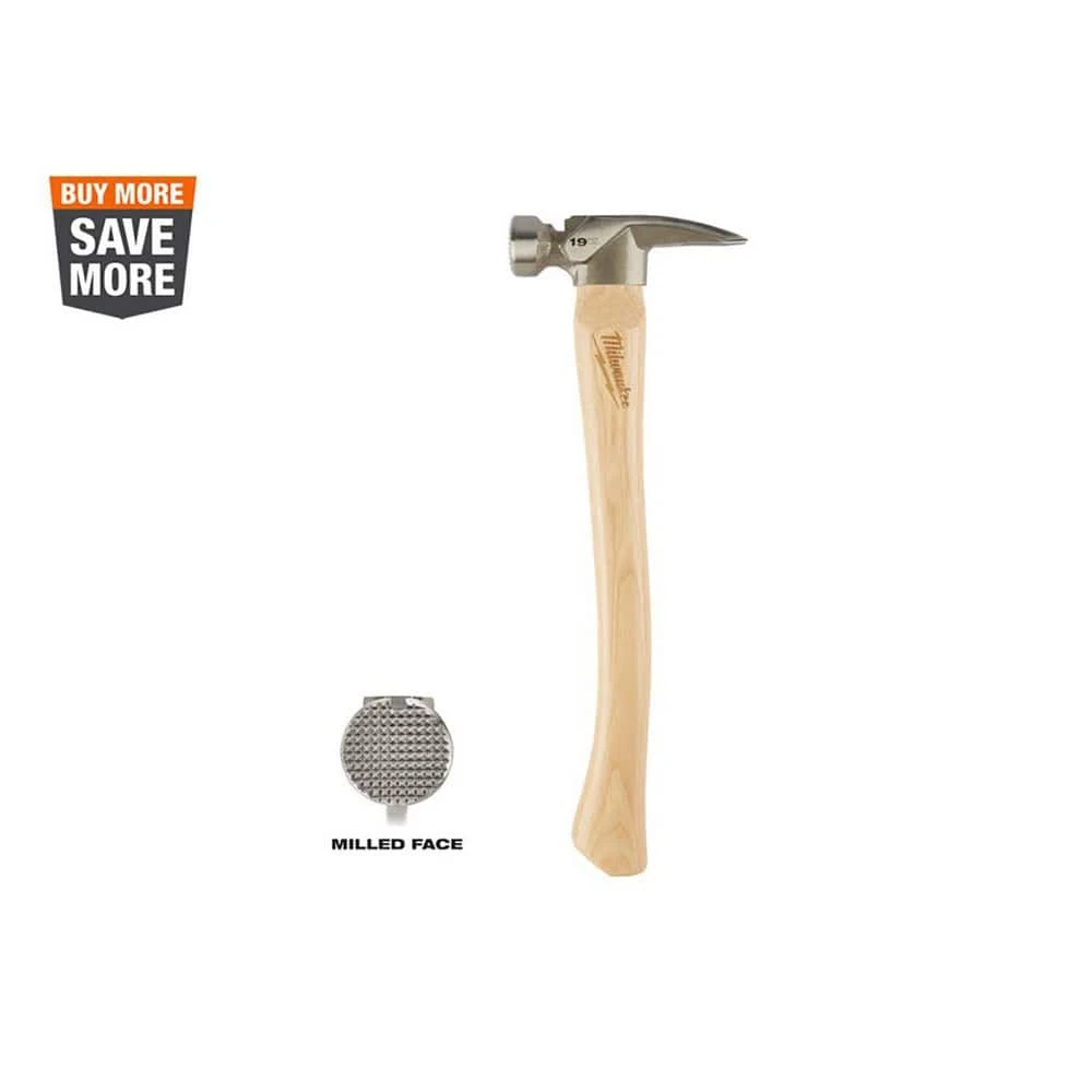 Our 19 oz. Milled Face Hickory Hammer is designed for our carpenters and craftspeople with a precision balanced design and naturally shock absorbing American Hickory handle to give you the Best Driving Performance. The wood handle framing hammer has a magnetic nail set in the metal head to help you work more productively. It also s an axe-style curved handle that gives you a better, more comfortable grip on the hammer as well as an anti-ring claw.