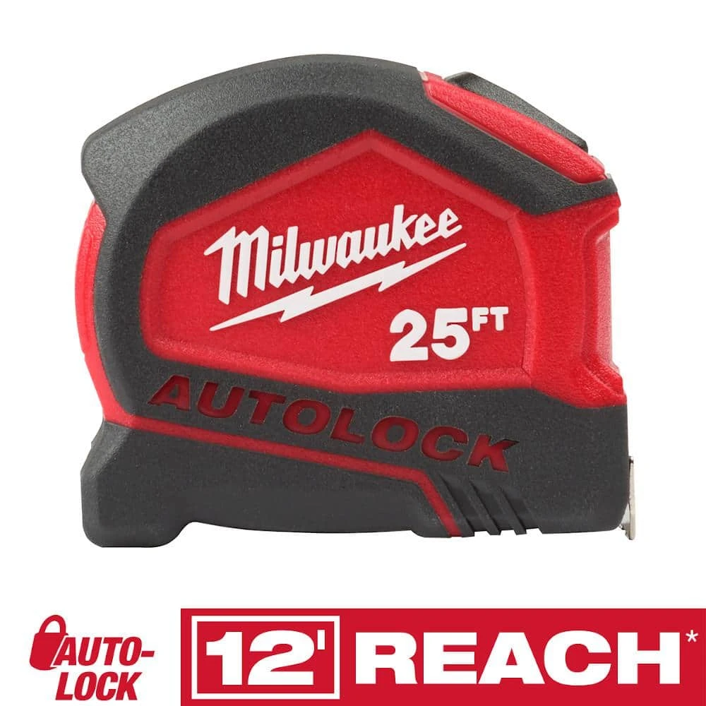 The Milwaukee 25 ft. Compact Auto-Lock Tape Measures deliver up to 12 ft. of reach. The auto-lock design automatically locks the user’s blade in place for quick and efficient measuring. These tapes are equipped with wear resistant nylon blade protection and an Impact-resistant 5-point reinforced frame to withstand the jobsite. The tape blade also features a Fractional scale