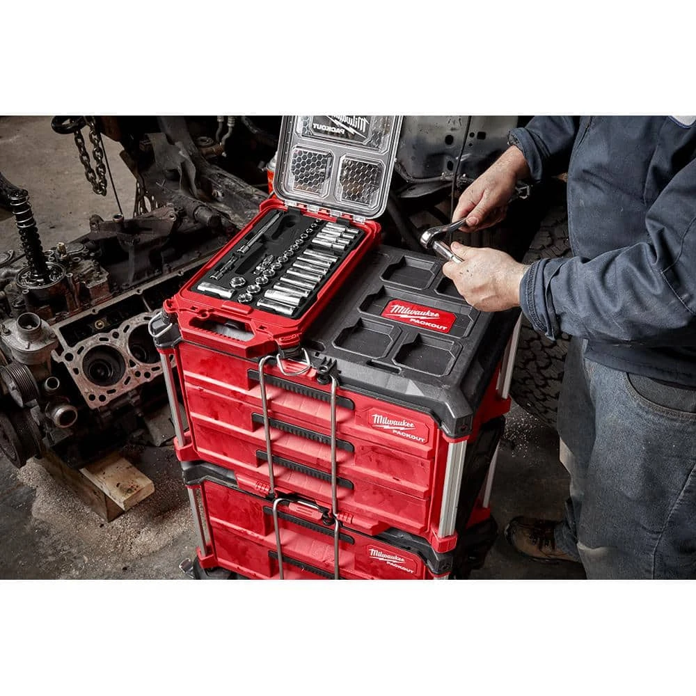This Milwaukee Combo Kit features a 90-tooth ratchet tool that provides 4 degree of arc swing and a slim profile for work in tighter spaces. The included ratchet and socket set has FOUR FLAT Sides that prevent rolling and are wrench compatible. Sizes are stamped into each socket for easy-to-read visibility. Users can keep this 32-piece. Drive Ratchet and Socket Set organized in the included PACKOUT Compact Low-Profile Organizer with a clear top for easy identification of parts at a glance. This PACKOUT Organizer is IP65 rated and built from impact-resistant materials for durability on and off the jobsite. The Compact Low-Profile Organizer is part of the Milwaukee PACKOUT Modular Storage System, allowing users to custom build storage systems to easily transport and organize their tools and accessories. This Milwaukee Combo Kit includes a 32-Piece 3/8 in. Metric Drive Ratchet and Socket Set and a PACKOUT Compact Low-Profile Organizer.