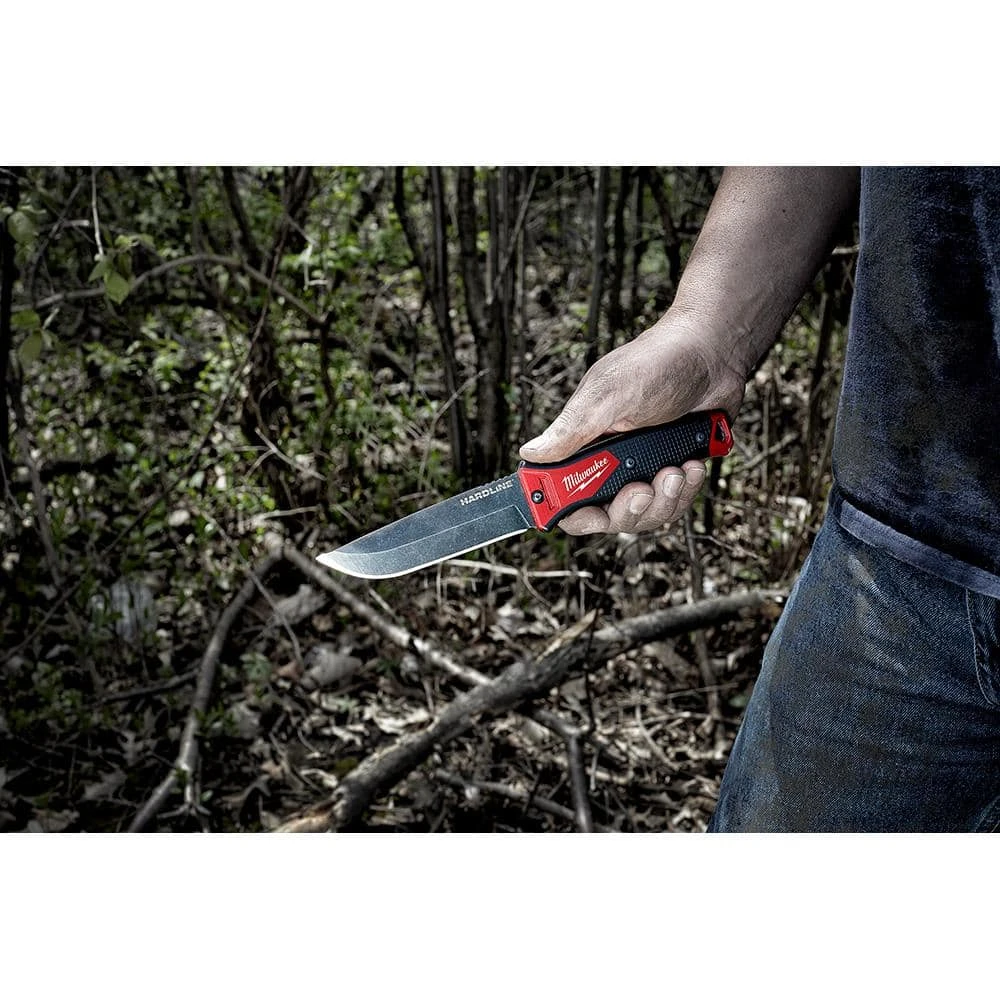 Experience the uncompromising performance of this 5-in. Milwaukee HARDLINE knife, which features an AUS-8 steel blade with a full tang to deliver unmatched durability. A great choice for tough cuts, this knife is crafted with an overmolded handle to provide a strong, secure grip. A multi-position sheath enables multiple carry options. It can be mounted vertically or horizontally on belts and mounting systems.