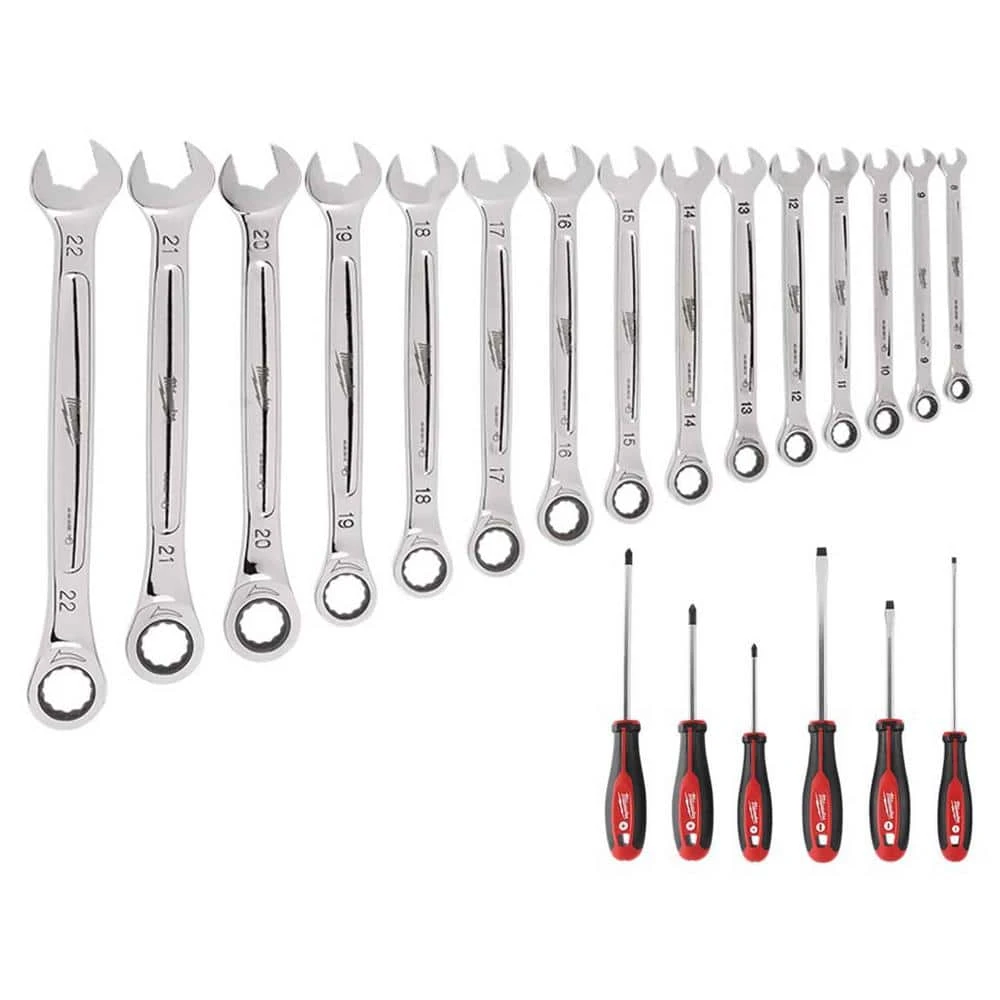 The MILWAUKEE 15-Piece Metric Ratcheting Combination Wrench Set and 6-Piece Screwdriver Set have visible ID markings for easy tool identification. The ratcheting combination wrench set offers a 2.5° of arc swing for efficient work in tight spaces and MAX BITE for 25% more torque and better grip force, innovative I-Beam Handle Design allows superior user comfort, even while applying high torque. Milwaukee screwdrivers have comfortable tri-lobe handles, wrench-ready hex shanks, and magnetic tips for comfort and efficiency on the jobsite. Milwaukee Tool stands behind their products offering a Lifetime Warranty on the combination wrench set and a Limited Lifetime Warranty on the screwdriver set.