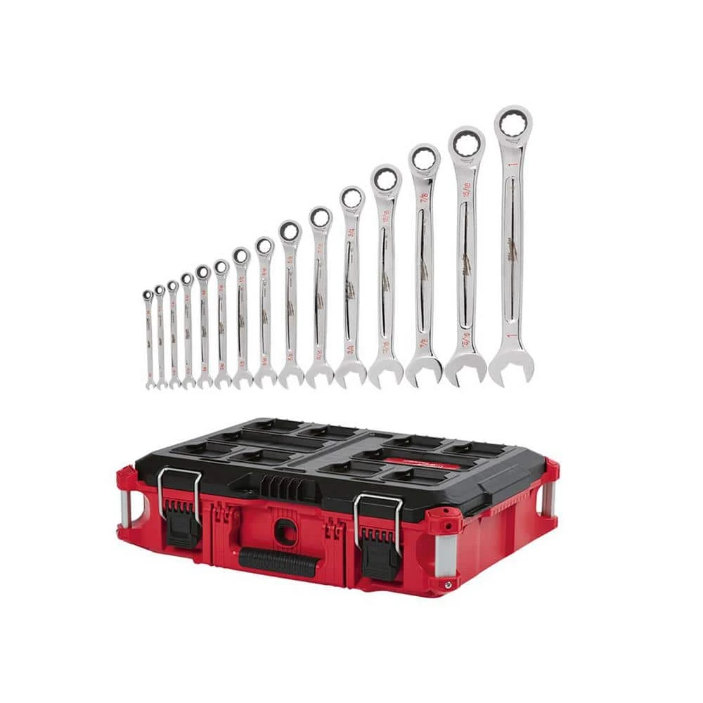 - Includes: one 48-22-9416 SAE combination ratcheting wrench set (15-piece) and one 48-22-8424 PACKOUT 22 in. tool box