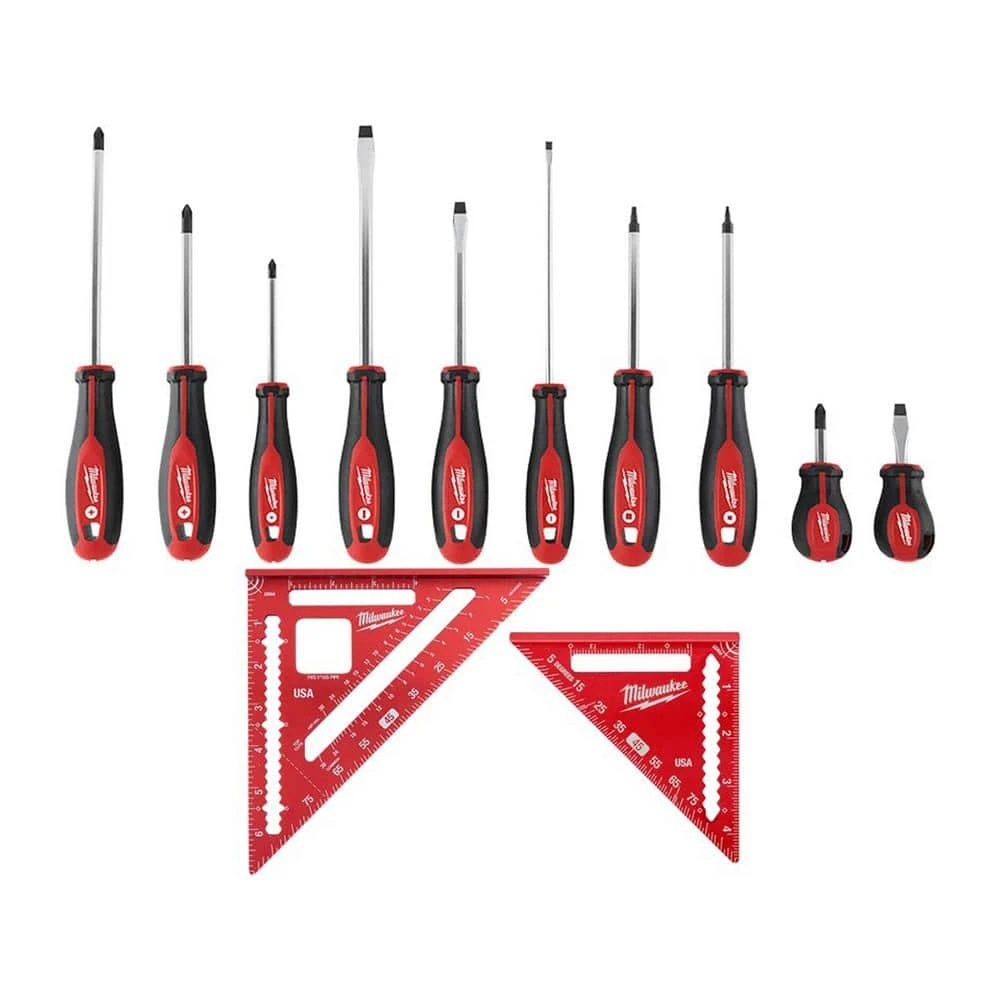 Featuring hardened tips and forged shanks the Milwaukee 10-Piece Screwdriver Set provides professional grade solutions and durability to the user. Bit types are marked on the cap of each tool for quick identification and increased efficiency. The comfortable tri-lobe handle allows users to comfortably apply more leverage. This Milwaukee Square Set includes a 7 in. Rafter Square and a 4-1/2 in. Trim Square. Both Milwaukee squares feature high visibility laser etched markings that will not wear off after heavy use and are built from a durable extruded aluminum frame. The 7 in. Rafter Square features scribe notches from 1 in. to 6 in. allowing for quick and accurate marks on lumber and the 1 in. cutout helps prop pipe allowing users to cut it more easily on the jobsite. The 4-1/2 in. Trim Square is 35% smaller in size to easily fit into tight work spaces as well as pockets and pouches. The 1/4 in. and 3/8 in. dual measurement heel also allows you to perform quick marks. Both squares are back by a Milwaukee Limited Lifetime Warranty.