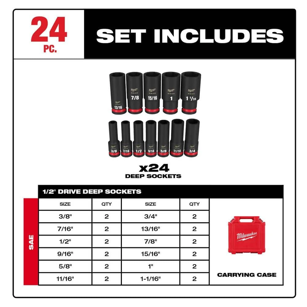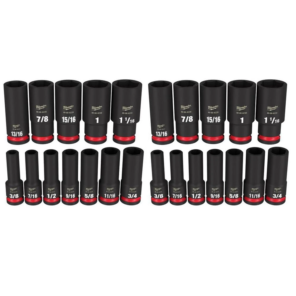 The Milwaukee 24-Piece SHOCKWAVE Impact Duty 1/2 in. Drive SAE Deep 6 Point Socket Set features the boldest, longest-lasting markings and extreme impact durability in high torque applications. The stamped and ink-filled size marking enables users to select the right socket every time throughout the life of the socket. These Milwaukee sockets are engineered with high strength forged steel for optimized performance in heavy-duty applications. The non-slip hex geometry prevents fastener rounding, and a dual-hole design and ring groove allow for easy socket attachment and removal. The storage cases are impact resistant and nest together for easy stacking and storage. All SHOCKWAVE Impact Duty Sockets backed by a Lifetime Guarantee and meet ASME industry standards.