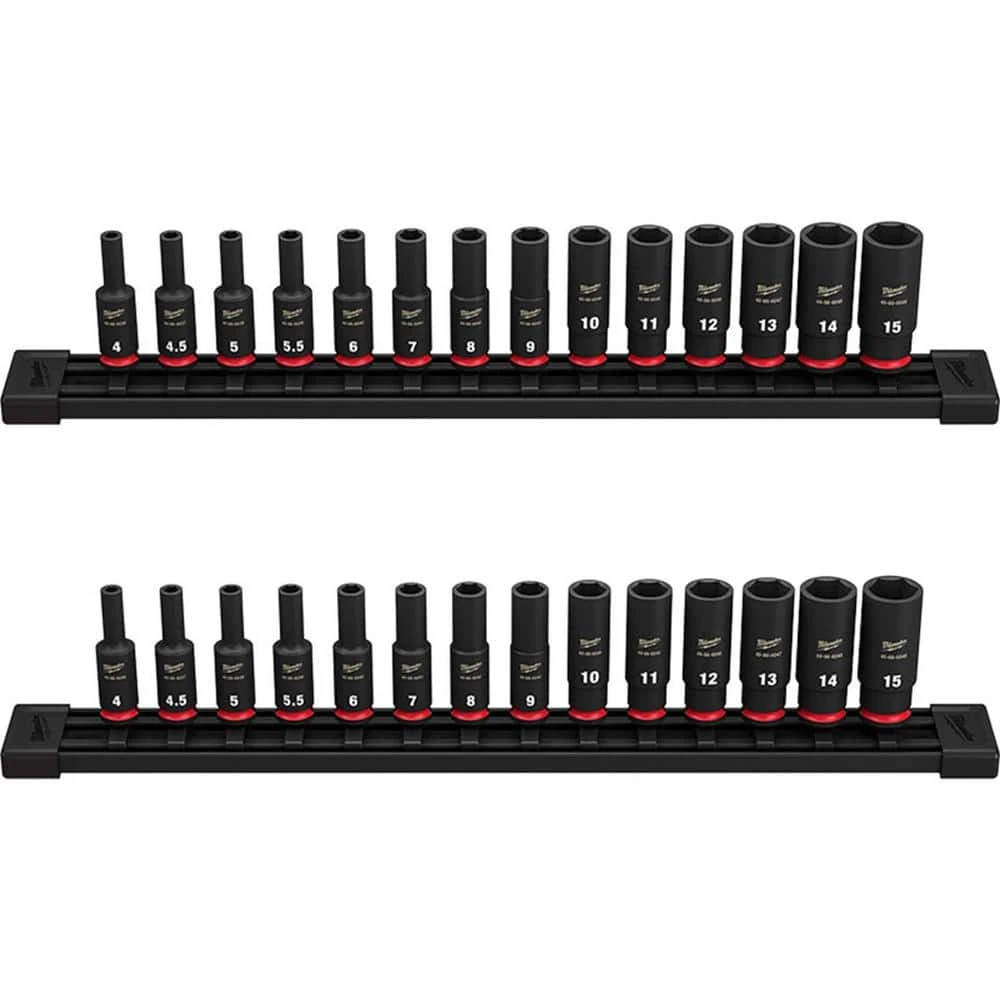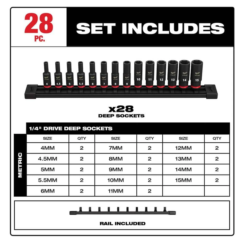 The Milwaukee 28-Piece SHOCKWAVE Impact Duty 1/4 in. Drive Metric Deep 6 Point Socket Set features the boldest, longest-lasting markings and extreme impact durability in high torque applications. The stamped and ink-filled size marking enables users to select the right socket every time throughout the life of the socket. These Milwaukee sockets are engineered with high strength forged steel for optimized performance in heavy-duty applications. The non-slip hex geometry prevents fastener rounding, and a dual-hole design and ring groove allow for easy socket attachment and removal. The customizable Socket Rail comes with removeable end caps to add or take off socket clips for optimal storage. All SHOCKWAVE Impact Duty Sockets backed by a Lifetime Guarantee and meet ASME industry standards.