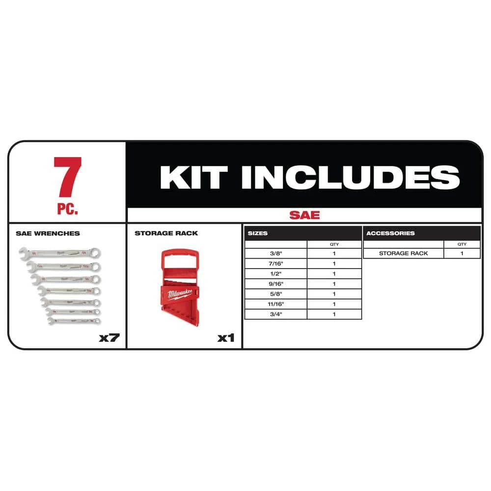 - 48-22-9407 includes: combination SAE wrench mechanics tool set (7-piece) with 3/8 in., 7/16 in., 1/2 in., 9/16 in., 5/8 in., 11/16 in., 3/4 in. wrenches